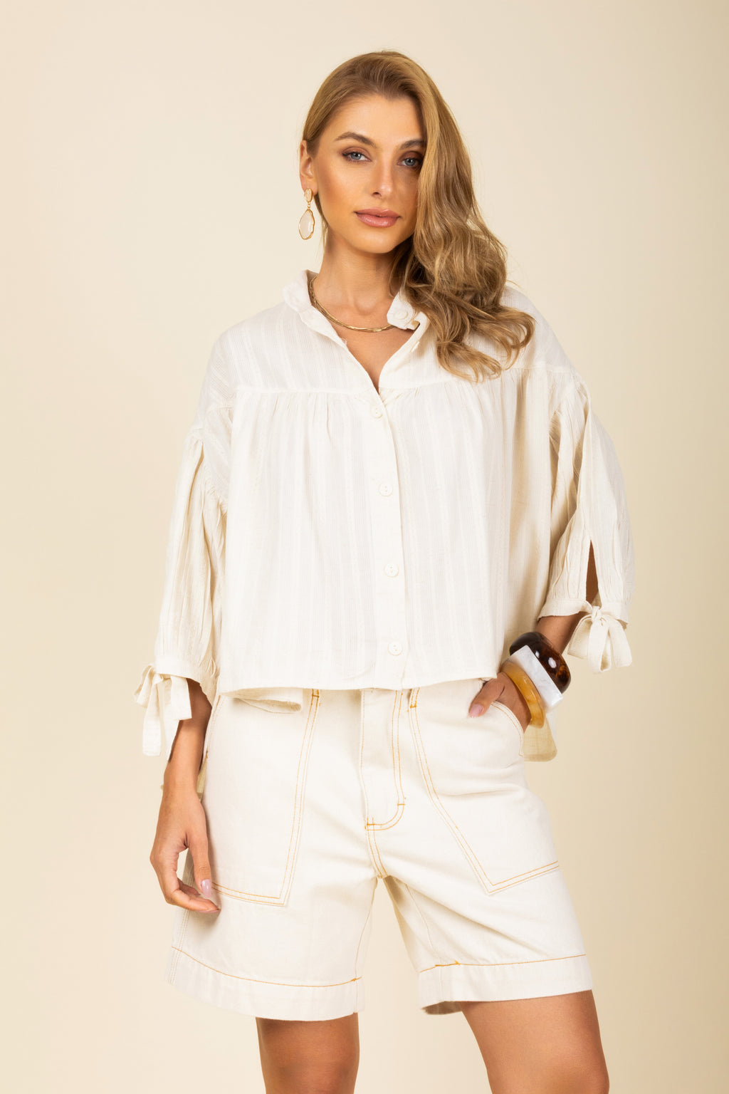 Bermuda de algodão com modelagem reta, cintura média com passantes e fechamento frontal por botão e zíper. Possui bolsos frontais aplicados, detalhe de costura aparente contrastante e barra dobrada. Peça versátil e confortável, ideal para composições casuais e sofisticadas.