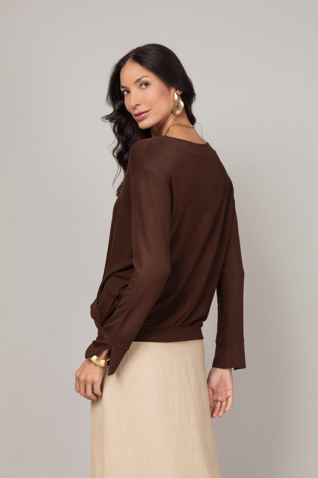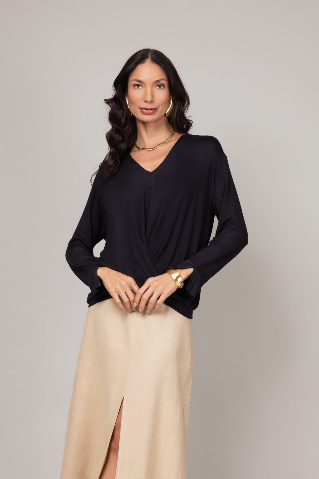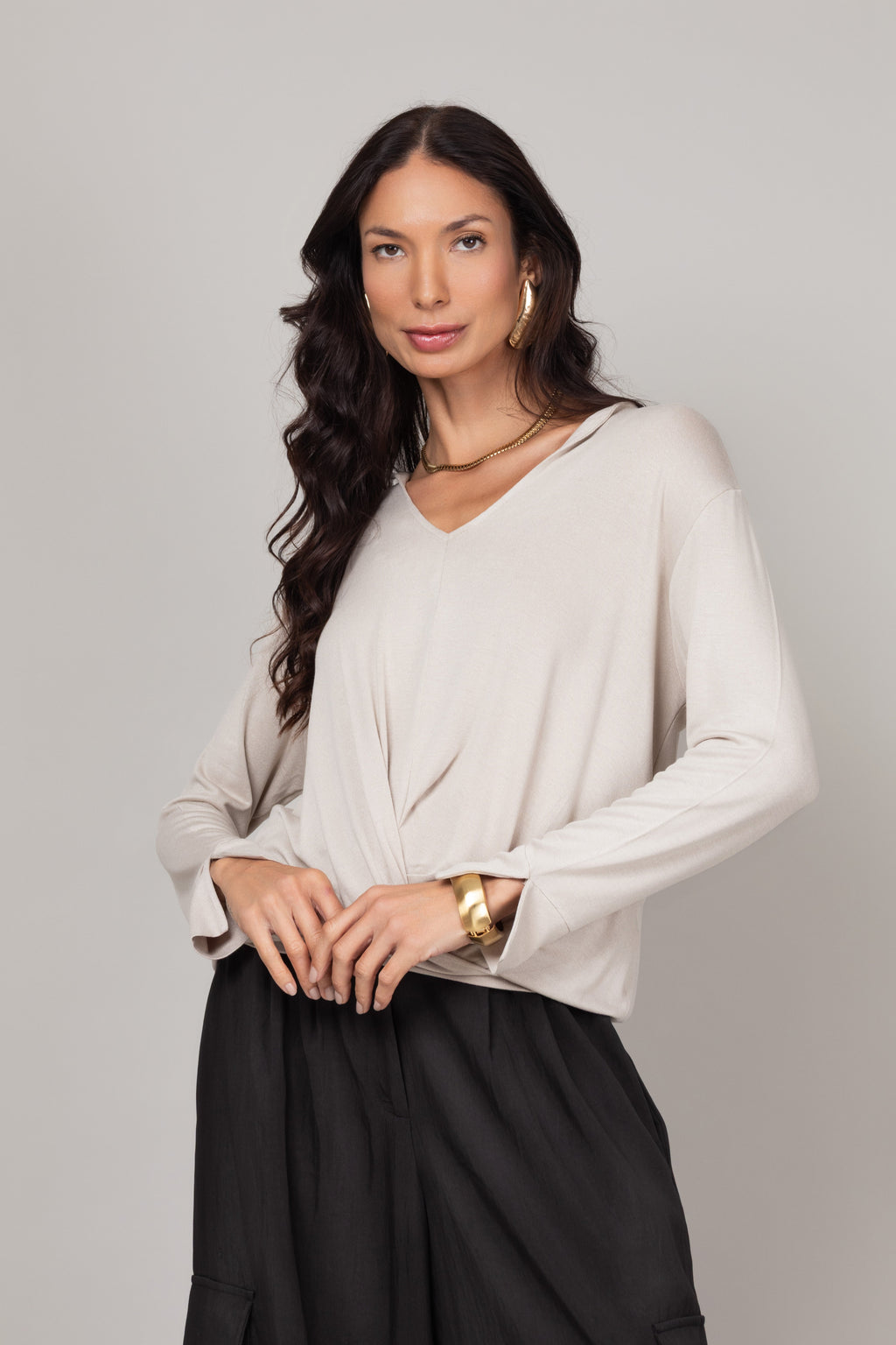 - Design transpassado frontal que cria um efeito drapeado sútil.